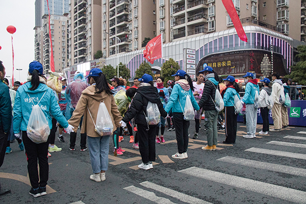 志愿者为选手发放运动饮料
