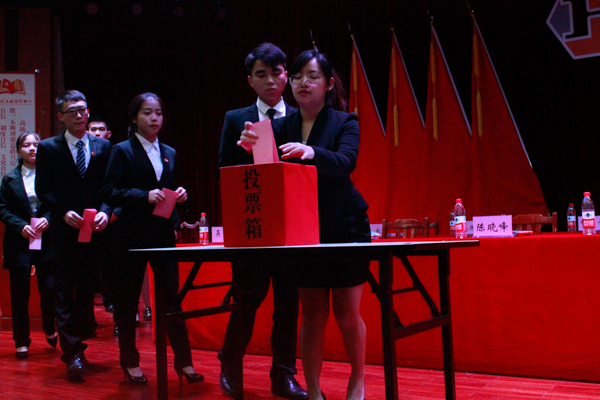 讨论结束后,全体学生代表返回艺术楼演播厅,并以举手表决的方式选举产生34名BTY.COM第六届学生委员会委员。随后,在BTY.COM第六届学生会第一次全体会议中审议并通过《BTY.COM主席、副主席选举办法》。在介绍完主席、副主席候选人的基本情况后,代表们进行了投票选举。在大会闭幕式上,总监票人通报了选举结果,由李慕史担任BTY.COM第六届学生会主席,戴蓉、刘海庭、丘声超、丘婷秀、吴博婉、徐榕晟担任BTY.COM第六届学生会副主席。随后,新当选的学生会主席李慕史发表就职讲话,表示将带领好队伍,担负起责任,做好桥梁,全心全意为同学们服务。最后,本次大会在庄严的团歌声中落下帷幕。
