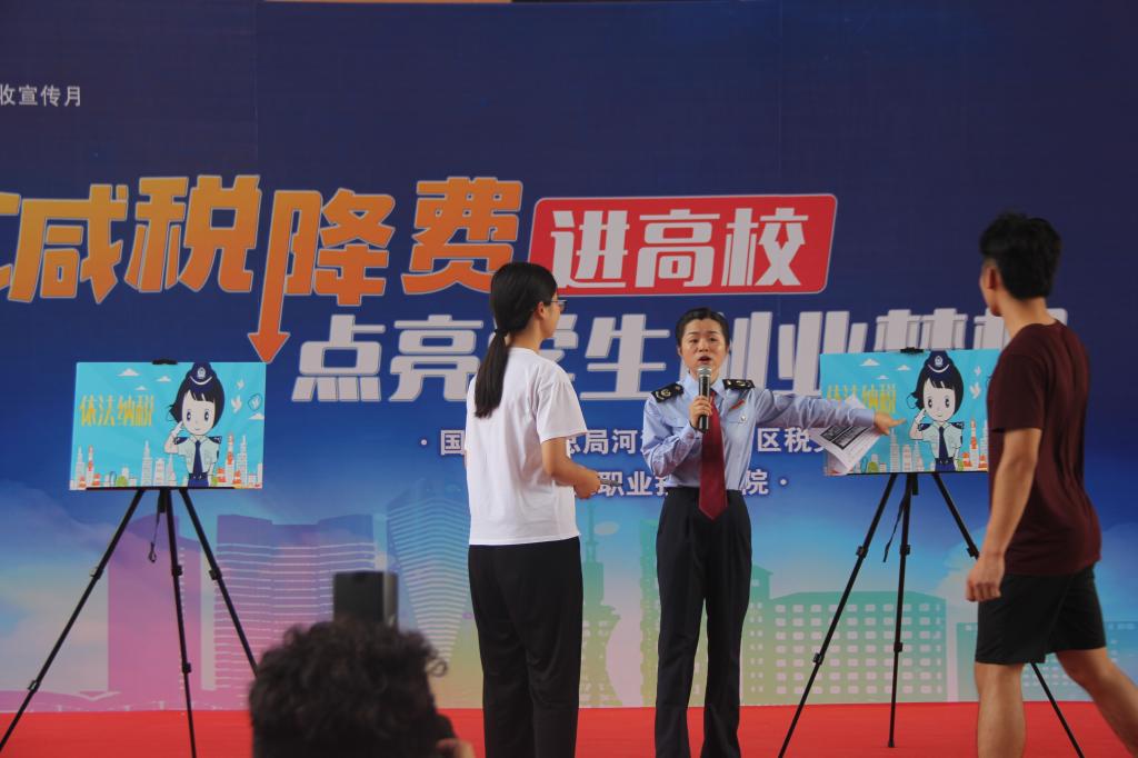 在宣传活动中,江东新区税务局的工作人员就国家税法及最新“减税降费”的政策进行了现场解读,为在座学生一一解答了相关疑惑。