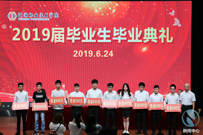 赖小景副校长宣读了《关于表彰2019届全国职业学院技能大赛获奖学生的决定》。叶国英副书记为在2019年全国职业院校技能大赛中荣获全国三等奖的11名同学进行颁奖,唐汉芳副校长为全国职业院校技能大赛荣获全国二等奖的4名获奖学生进行颁奖。
