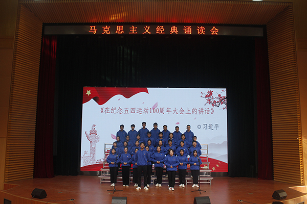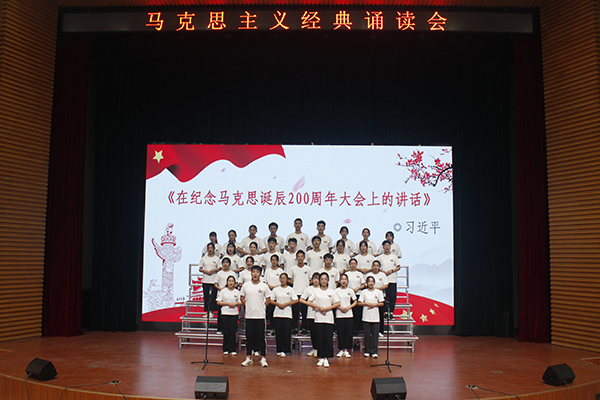 在诵读会中,各组学员以整洁的着装、饱满的精神轮番上阵,伴着婉转的旋律和铿锵有力的节拍,声情并茂地朗诵了《十九大报告》节选、《在纪念马克思诞辰200周年大会上的讲话》、《习近平在北京大学师生座谈会上的讲话》、《在纪念五四运动100周年大会上的讲话》、《习近平在纪念红军长征胜利80周年大会上的重要讲话》、《青年运动的方向》、《反杜林论》、《全体中华儿女的共同向往》等经典名篇。