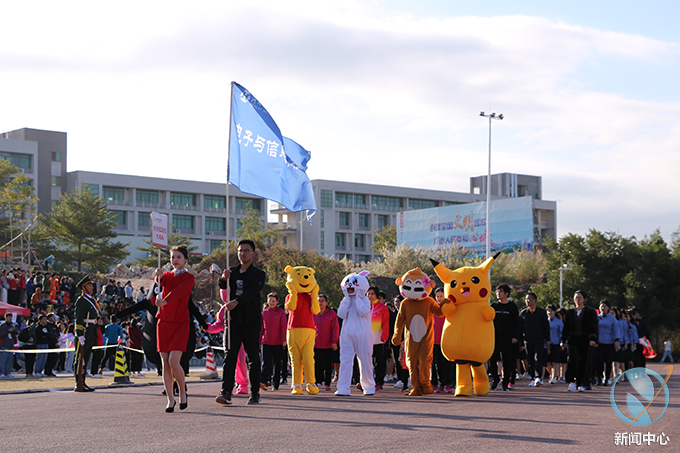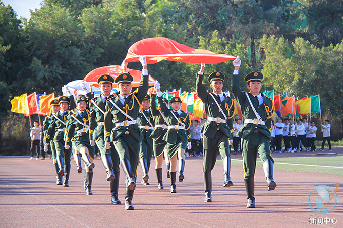 伴随着雄壮的《运动员进行曲》,国旗护卫队、校旗队、会旗队、彩旗队、裁判员队及各学院代表队的方阵队伍队员身着整齐的服装,迈着整齐的步伐,齐声高喊口号向主席台走来,成为运动场上一道亮丽的风景,展现出我校师生积极向上、朝气蓬勃的风采。伴随着国歌响起,国旗随风飘扬,全场肃立,全体师生屏息凝神行注目礼,开幕式在庄严的升旗仪式中拉开序幕。