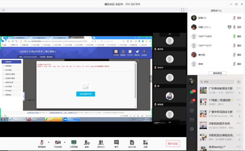 在前期与优慕课、超星和智慧树等网络教学平台技术服务工程师进行商榷并开通相关服务的基础上,信息中心技术人员组建了微信群开展网络教学辅导并进行线上培训的准备工作,教师在群内获取网络教学平台培训信息,为培训打下基础。