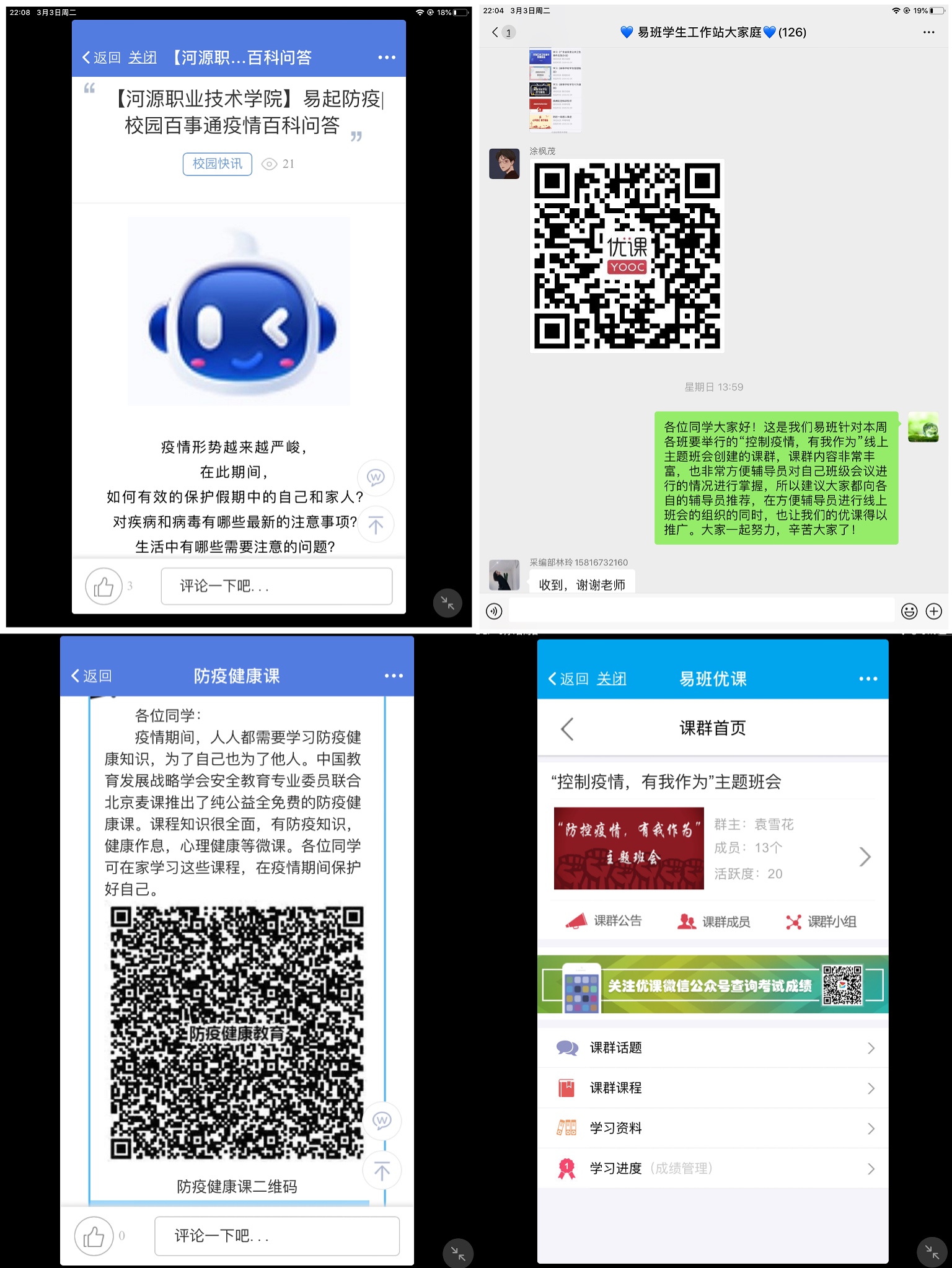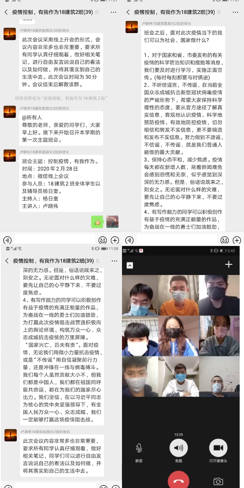 疫情期间,网上干扰信息较多,为了让同学们及时掌握正确的防疫知识,老师们每天在班级群发布权威疫情情况,开展科普宣讲,学病毒知识、学防控要点,教育和引导同学们了解科学防疫知识。线上班会课正式开始,同学们在班级群里积极开展讨论,纷纷建言献策,分享自己对这次卫生防“疫”战的看法。大家齐心协力,排除“谣言”,建立起一个风清气正的防疫氛围。