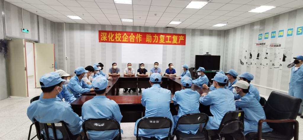 本次研讨活动的第一个议程是市团委领导慰问河职院在职实习生。我校在中兴通讯河源基地的在职实习生共有55人,分别来自应用电子技术和移动通信技术等专业,主要是现代学徒制和订单班学生。首先由陈晓峰书记主持了实习生座谈会,会上陈书记询问了同学们实习收获和感受,以及大家对实习单位的反馈评价。实习生以专业为单位依次发言,把自己在实习中的所见所闻做了充分表达。领导们认真听取了实习生的发言,并对实习过程中遇到的问题做了详细的解答,并对他们疫情期间积极参与企业的复工复产表示感谢,鼓励他们安心实习,努力工作,嘱咐他们注意自身的健康防护和实习安全。