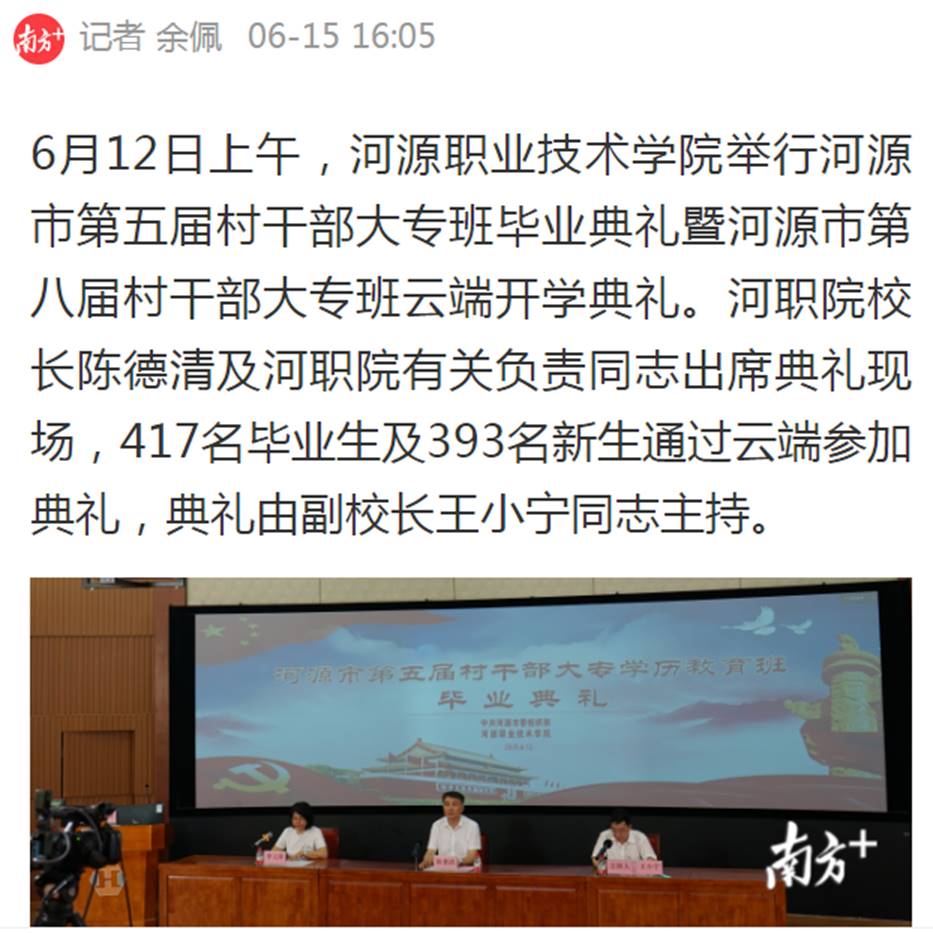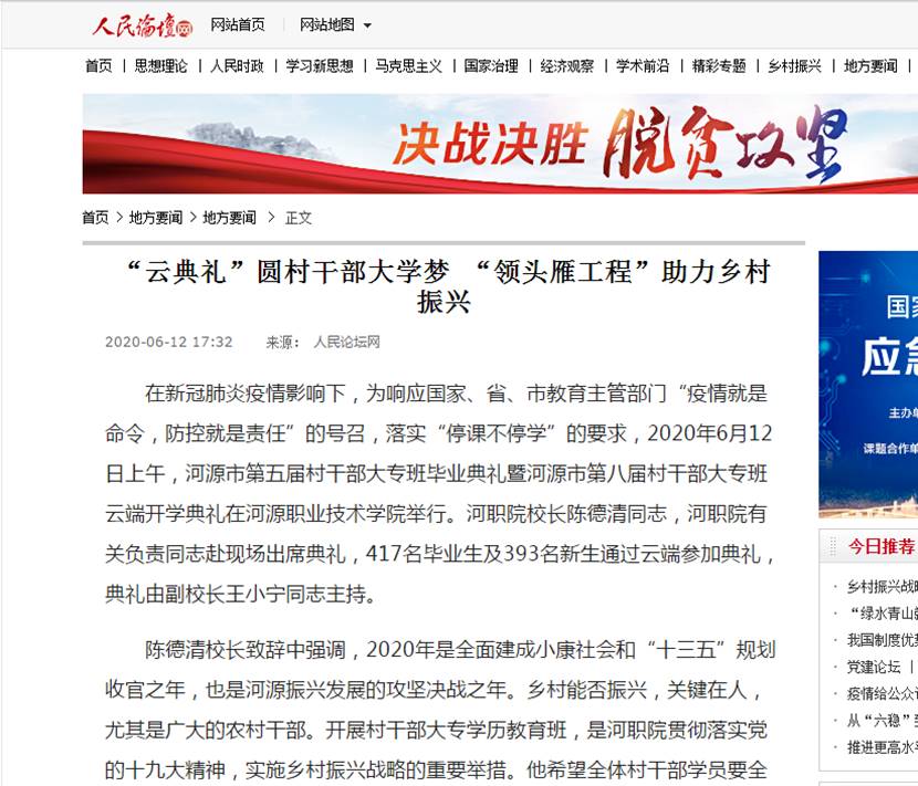 以下是人民论坛网、南方报业集团南方+、广州日报、河源电视台、河源日报近期对我校第五届村干部大专学历教育班云端毕业典礼暨第八届村干部大专学历教育班云端开学典礼的相关报道内容链接: