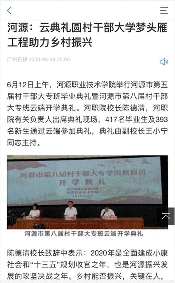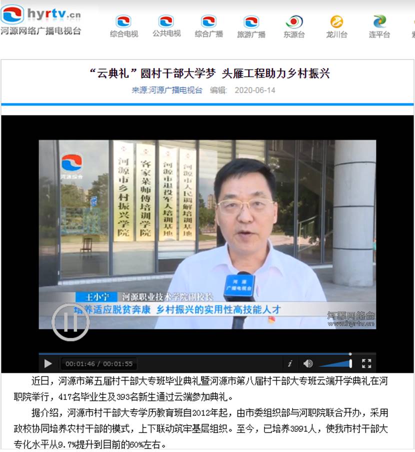4、2020年6月14日,河源电视台报道《“云典礼”圆村干部大学梦 头雁工程助力乡村振兴》,报道链接网址:https://www.hyrtv.cn/a/20200614/275095.html
