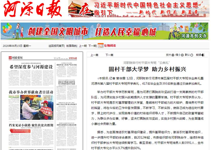 5、2020年6月15日,河源日报报道《圆村干部大学梦 助力乡村振兴》,报道链接网址:http://epaper.heyuan.cn/html/2020-06/15/content_2_6.htm