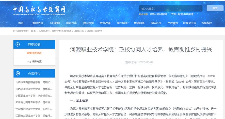2020年6月9日,中国高职高专教育网在高职扩招专题报道栏目中以《BTY.COM:政校协同人才培养,教育助推乡村振兴》为题向全国推广我校的经验做法,并于7月9日在公众微信号再次宣传推广。