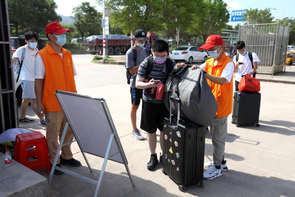 学生返校到达学校东门后,在工作人员指引下有序排队,依次经过扫码验证、行李消杀、更换口罩、体温检测、现场报道等环节后进入校园。