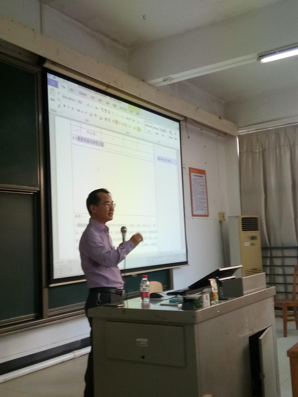 10月20日下午,我校在教学楼C201室举办“课程思政示范课程申报辅导会”。辅导会由教务处负责人戴卫军主持,赖星华副研究员主讲,各学院意向申报老师100多人参加了会议。陈德清校长闻听此讯,特地到现场看望大家,为与会者鼓劲。