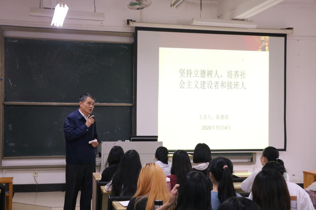 11月4日下午,学校校长陈德清教授在教学楼C202以“坚持立德树人,培养社会主义建设者和接班人”为题讲授思政第一课。思政教师代表、工商管理学院学生代表到场听课。