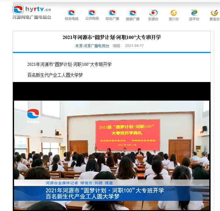 3、2021年4月17日,河源电视台报道《2021年河源市“圆梦计划·河职100”大专班开学》。报道网址链接:https://www.hyrtv.cn/a/20210417/299746.html
