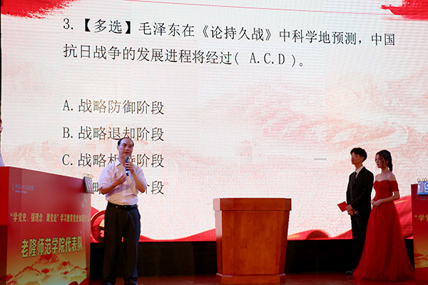 为贯彻落实学校党史学习教育工作部署要求,使青年学生深入了解党史知识,感受中国共产党百年来所走过的光辉历程,激发强烈的爱国情、报国志。6月3日晚,我校于艺术楼演播厅举行“学党史,强信念,跟党走”党史学习教育知识竞赛。出席本次比赛的有我校副校长赖小景,相关部门同志及参赛成员。