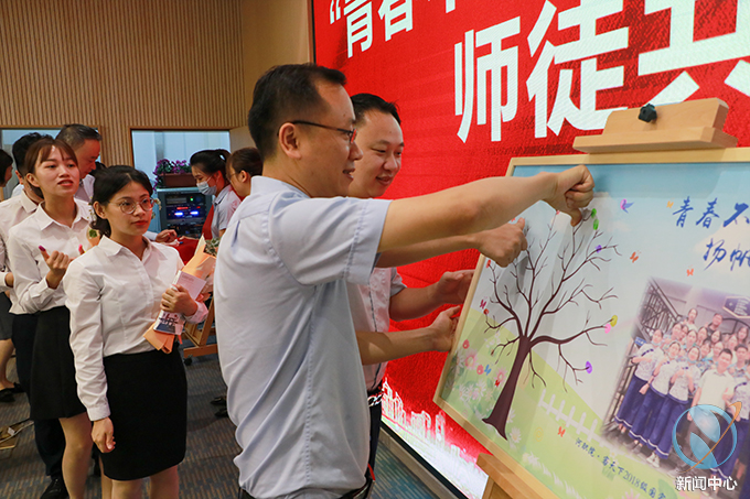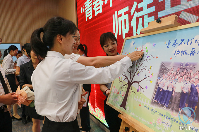 鸿客集团曾金杰总裁助理、鸿客集团文旅中心景区宋军总经理、文旅研学公司总经理叶文杰、客天下景区酒店营销总监魏正强和我校韦荣书记颁发2018级河职院·客天下国家现代学徒制储备干部精2019-2021年“精英计划·爱在客天下”奖助学金;我校俞彤院长和科研处何智聪处长对2018级河职院·客天下国家现代学徒制储备干部精英班精英学徒进行表彰;鸿客集团曾金杰总裁助理、文旅研学公司总经理叶文杰和我校袁光华副校长对学徒制班2020-2021年企业第一责任导师和优秀岗位带教师傅进行表彰;随后举行“河职院·客天下国家现代学徒制储备干部精英班”的出师结业仪式,导师们与学徒们共同完成“青春不打烊、扬帆再起航”指纹画。