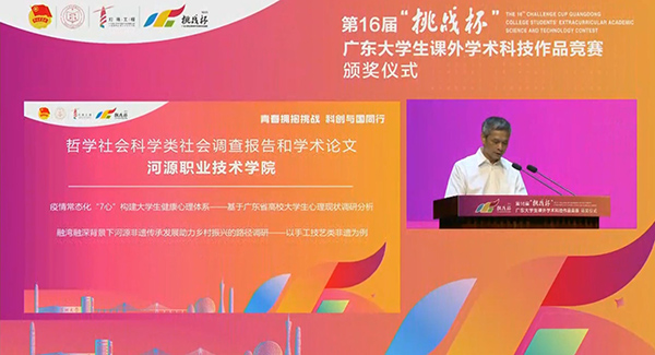 7月18日,由省团委、省教育厅、省科技厅、省科协、省社科院、省学联共同主办的第十六届“挑战杯”广东大学生课外学术科技作品竞赛终审决赛在深圳大学顺利举办。我校学子共取得2项特等奖,2项二等奖,1项三等奖的优异成绩。在颁奖仪式上,广东省高等教育学会发布了首个《广东省高等院校大学生群众性创新创业活动活跃度研究报告(2021)》。报告显示,我校名列广东省高职高专院校创新创业活动活跃度排名前20强。