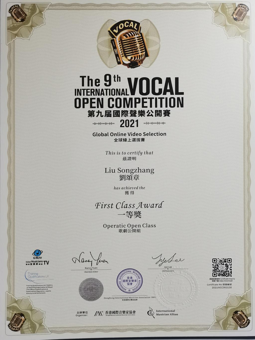 刘颂章老师凭借扎实深厚的艺术功底,丰富的舞台表演经验,华丽的男高音色彩,分别演唱了意大利和法国两个国家不同语言和风格的歌剧咏叹调作品,获得了众多评委专家组的一致认可和高度评价,最终获得第九届国际声乐公开赛(全球线上选拔赛)“歌剧公开组一等奖”!