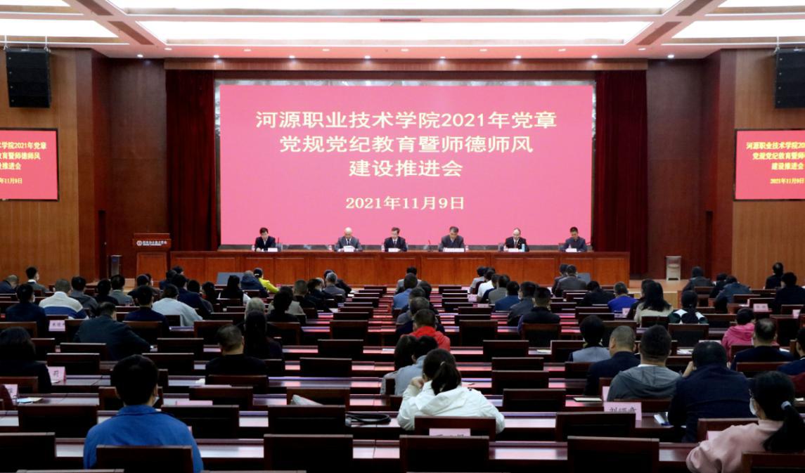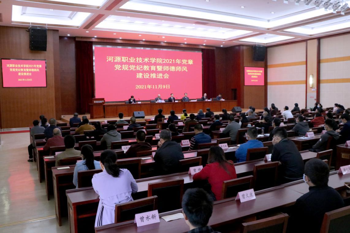 11月9日,我校在学术交流中心报告厅召开全校党章党规党纪教育暨师德师风建设推进会,学校领导班子成员、行政副科以上教职工、全体专业主任以及副高职称以上专任教师参加会议。会议由陈德清校长主持。