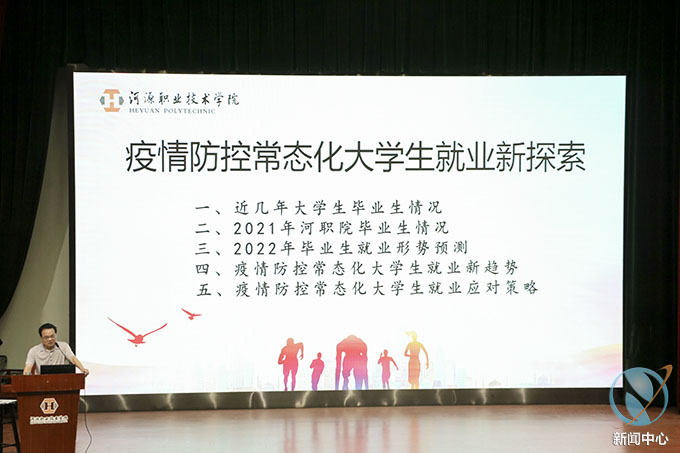 柳晓夫主任针对疫情防控常态化大学生就业新探索分五点进行分析,一是近几年大学生毕业生情况,“新一线”城市对大学生的吸引力不断增强,其中2019届毕业生在长三角地区就业的占比最高,本科为25.8%,高职为20.4%,大学毕业升学比例持续上升,本科计算机类、高职铁道运输类专业领跑薪酬榜,其中2019届本科毕业生月收入与2015届相比,起薪涨幅为23.6%,与2015届专科毕业生相比,高职生起薪涨幅为15.7%,大学生自主创业主要集中在教育、文娱及零售业,数据显示,“教育业”是2019届自主创业的最主要领域;二是2021年我校毕业生情况,全校各学院毕业去向落实率为98.35%,毕业去向区域最多的五个城市为广州市、河源市、深圳市、惠州市及东莞市,毕业去向最多的三个行业为“教育”领域、“软件和信息技术服务业”及“互联网和相关服务”,专升本人数的升学率为17.56%;三是2022年毕业就业形势预测,毕业生规模再创新高,竞争激烈,疫情影响仍有不确定性,校园招聘岗位数量也有所减少,就业市场对于求职者的素质不断提升,对去年待业的毕业生和留学回国的学生群体就业难度持续增加,大学生的就业观念发生改变成高期待、慢就业加剧,“互联网+就业”模式尚需完善;四是疫情防控常态化大学生就业新趋势,就业市场岗位需求的结构性矛盾和空间分布不均,企业招聘阵地由“线下”转战“云端”,就业市场对于求职者的素质要求不断提升,职业形态和工作模式呈现多样化特征;五是疫情防控常态化大学生就业应对策略,“云端”招聘成为疫情及后疫情时期的主要招聘方式,一为教育部“24365”校园网络招聘服务,“广东大学生就业创业智慧服务平台”及“河职院就业服务平台”。二为一手操办,每个毕业生利用手机绑定“广东大学生就业创业智慧服务平台”,上传“基本信息”、完善个人电子简历、填报毕业去向信息、校对和打印电子报到证、网上报道、网上申请改派及查看档案去向等。三为网里网外,网里关注就业政策升学扩招等关注官方举办公益网络就业服务平台,网外挖掘人脉资源、调整求职心态和提高综合素质。四为勇网职前,大胆触网,主动猎职,积极就业。