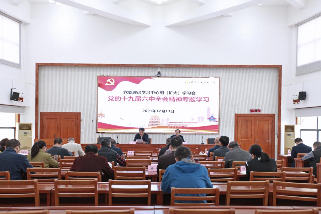12月13日,我校党委理论学习中心组(扩大)学习会在行政楼C108召开,专题学习党的十九届六中全会精神。我校党政领导班子成员,各部门、二级学院主要负责同志出席会议,会议由党委书记韦荣主持。