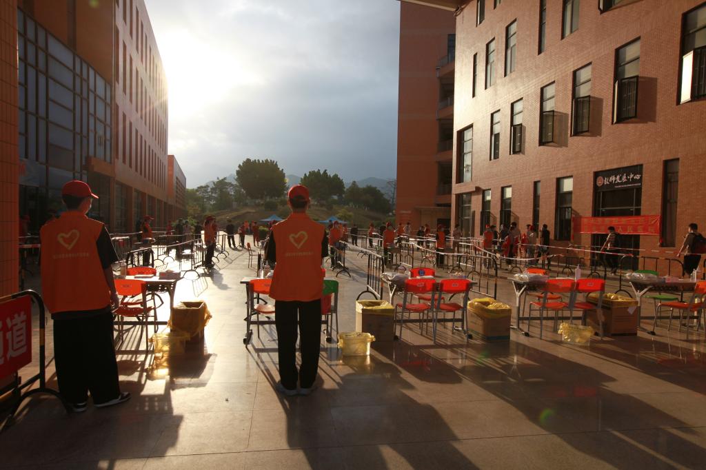 17日8时,全员核酸检测正式开始,全体师生自觉佩戴口罩,遵守秩序,在校园志愿者的耐心引导及帮助下,有序等待检测。医务人员严格按照检测规范流程进行扫码登记、核酸采样、环境消杀等工作。整个过程井然有序,快速高效。