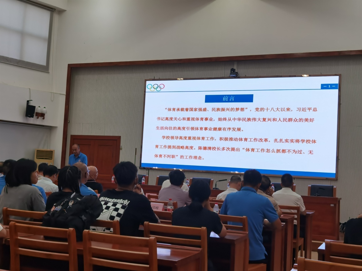 总结大会上,首先由杨柳青老师全面汇报了我校体育工作改革创新及参加广东省第十一届大学生运动会的情况。在校领导的关怀和支持下,2022年3月成立了以陈德清校长为团长的广东省大运会BTY.COM代表团,选拔出6支队伍,共参加6个大项8个组别44个项目的省大运会比赛。