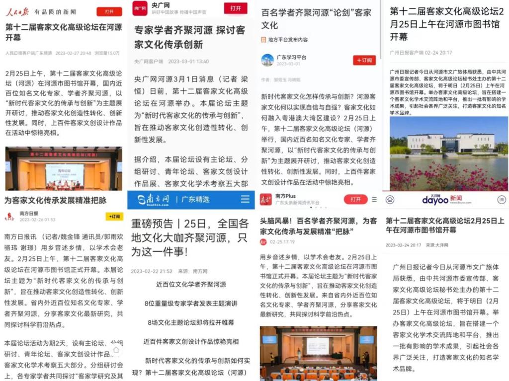 本届论坛亮点纷呈,近百位知名专家学者作客河源,70篇论文成果,上百件精美绝伦的设计作品在客家文创设计作品展展出。活动受到了人民日报客户端、学习强国”学习平台、央广网客户端、南方日报、南方网、大洋网客、河源日报、河源广播电视台、河源晚报、河源乡情报等20多家中央、省、市级媒体(新媒体平台)的广泛关注,纷纷推出有深度和影响力的新闻报道。其中,学习强国”学习平台先后以《百名学者齐聚河源“论剑”客家文化》和《河源举办客家文创设计作品展》为题两次推送此次论坛的举办情况。河源日报刊发了《第十二届客家文化高级论坛在我市举行——推动河源客家文化焕发新活力》整版报道,让更多的人了解到了此次论坛的成果及客家文化未来的发展方向。
