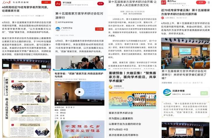 活动受到了人民日报客户端、学习强国”学习平台、南方日报客户端、南方网、河源日报、河源广播电视台、河源晚报、河源乡情报等10多家中央、省、市级媒体(新媒体平台)的广泛关注,纷纷推出有深度和影响力的新闻报道。其中,“学习强国”学习平台以《第十五客家方言学术研讨会在河源举行》为题推送此次研讨会的举办情况。河源日报刊发了《40所高校70名专家汇聚河源共论『客家话』——『把脉』客家方言 助力文化高质量发展》整版报道,让更多的人了解到了此次研讨会的成果及客家方言未来的发展方向。