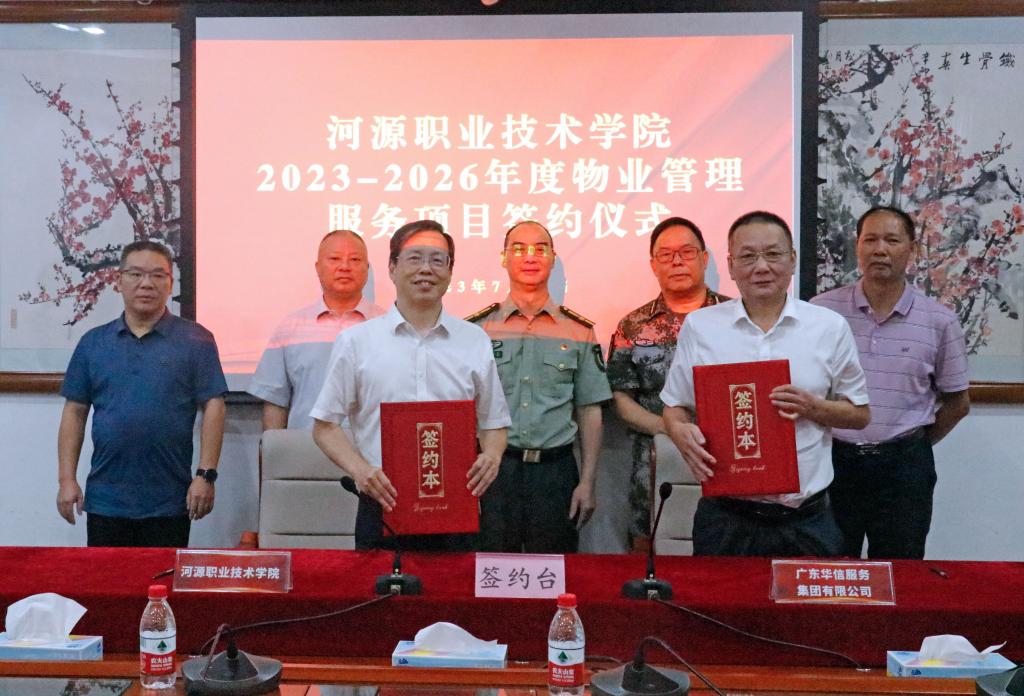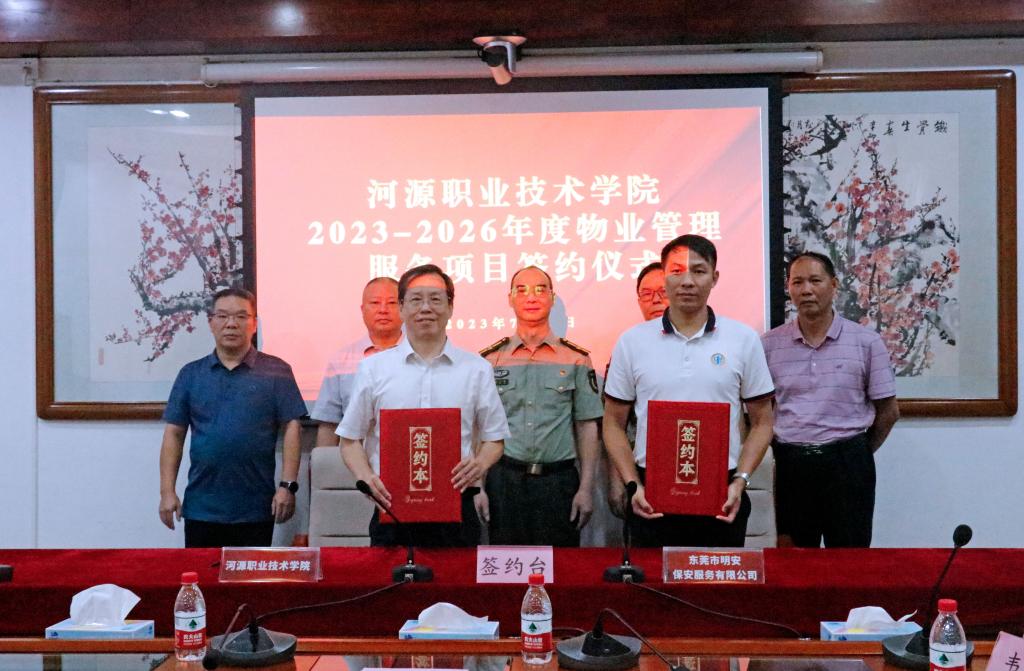 随后,学校韦荣书记代表学校分别与广东华信服务集团有限公司和东莞市明安保安服务有限公司就学校2023-2026年度物业管理和安保服务协议进行了现场签约。