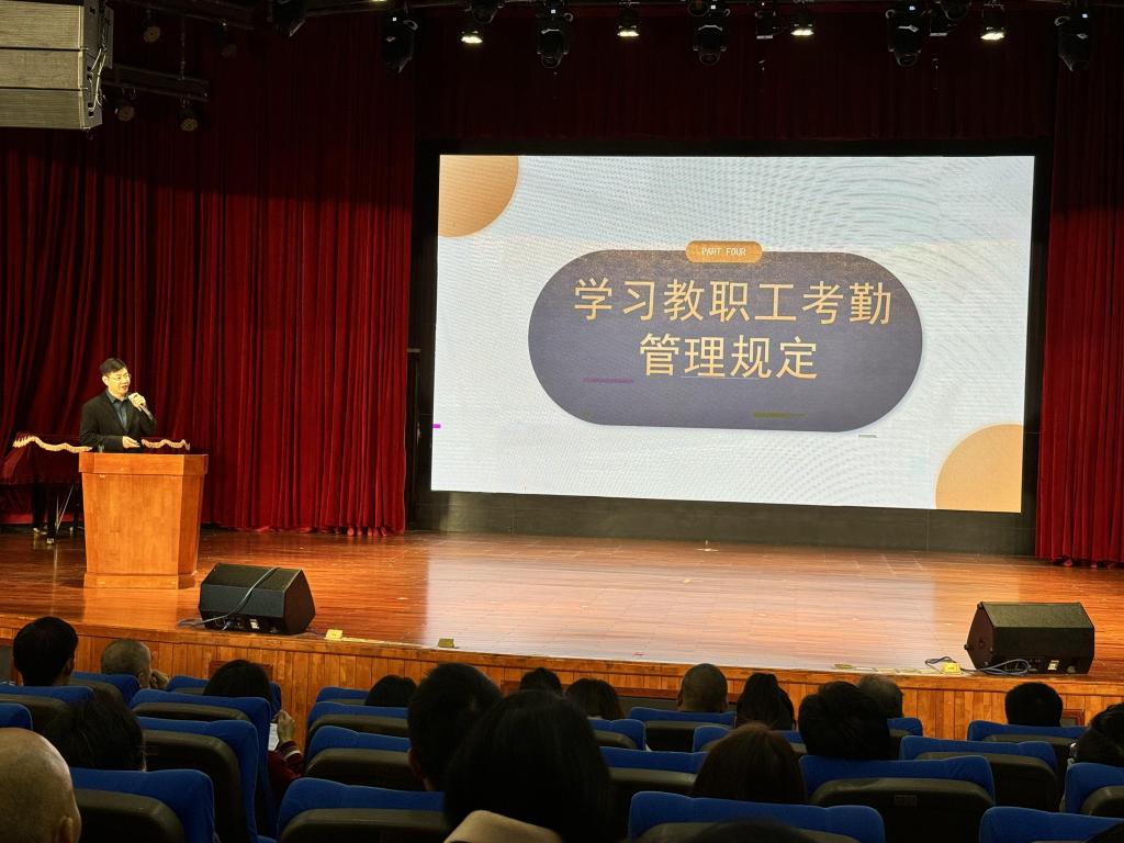 接着杜伟祥院长带领老隆师范学院全体教职工学习新修订的《BTY.COM教职工考勤管理规定》,对考勤管理规定的修订内容进行逐一说明,并对教职工较为关心的因公外出、请休假等相关规定进行详细解读。杜伟祥院长要求全体教职工要提高认识,严格执行考勤管理规定。