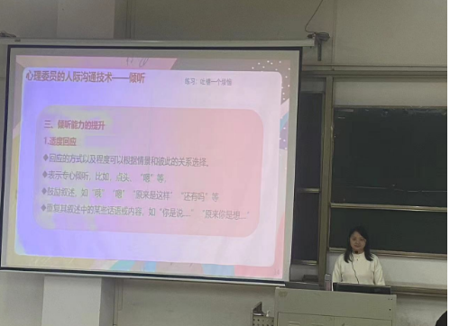 本次培训由心理中心的何晓清、姚辉东、吴宛玲、叶玲4位专职老师联合主讲,主要涉及心理委员的职责与工作范围、大学生常见心理问题识别、心理委员会谈技术、心理危机识别与干预等内容。