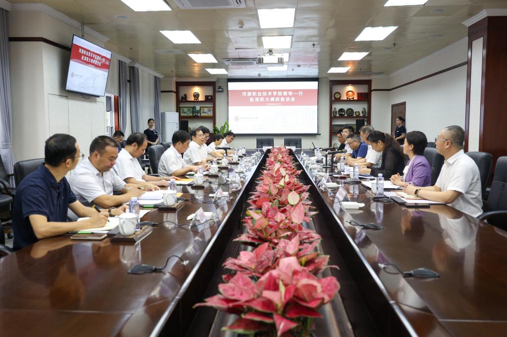 深职大党委书记杨欣斌对我校一行表示热烈欢迎,介绍了深职大建设中国特色世界一流职业技术大学的做法、经验和成就,并对我校近年来在教育教学、产教融合、社会服务等方面均取得显著成绩以及成为粤东西北地区唯一一所省域“双高”校表示祝贺。在讲话中,杨欣斌表示,结对帮扶协议的签订,标志着深职大和河职院携手开启合作发展的新篇章,希望两校加强沟通交流,实现资源共享、互惠互利、共同发展,一起走高质量发展之路,培养出更多高质量的人才,创造出更多高水平的科研成果,提供更好的社会服务,为教育强省建设作出新的更大贡献。