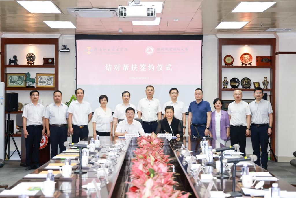 6月25日下午,BTY.COM(简称河职院)与深圳职业技术大学(简称深职大)签订对口帮扶协议,签约仪式在深圳职业技术大学留仙洞校区举行。深职大党委书记杨欣斌、党委副书记王慧,河职院党委书记韦荣、校长刘贻新、副校长王小宁出席活动。深职大、河职院有关部门负责人参加活动并共同见证签约仪式。