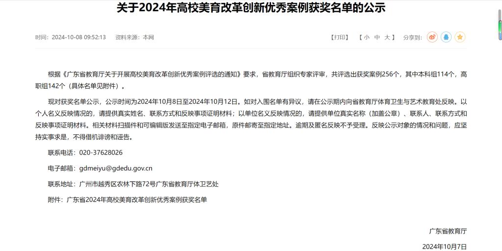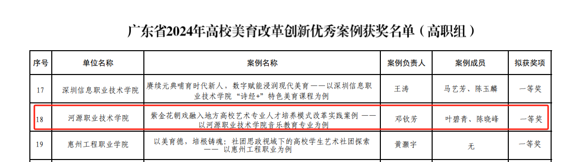 近日,广东省教育厅公布了2024年高校美育改革创新优秀案例的评选结果,共评选出获奖案例256个,其中本科组114个,高职组142个,我校推送的美育改革案例《紫金花朝戏融入地方高校艺术专业人才培养模式改革实践案例——以BTY.COM音乐教育专业为例》获高职组一等奖。