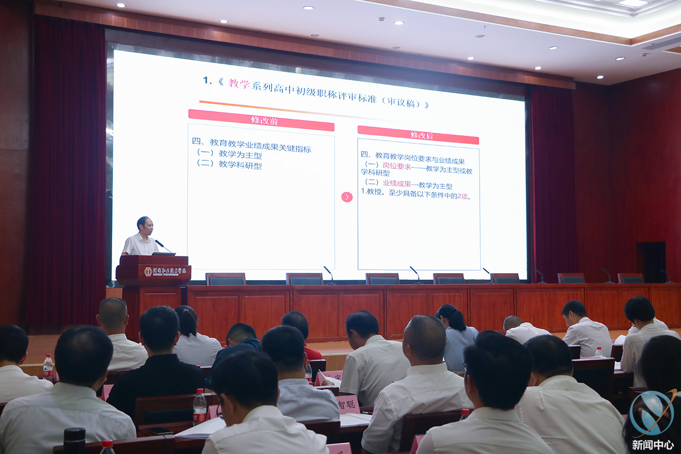 在会议上,学校党委委员、组织人事处处长黄建华从2023年职称评审概况、修订原则及修订内容等方面对《BTY.COM职称评审制度文件》的修订情况进行了说明。该文件的修订旨在进一步规范和完善学校的职称评审工作,激励教职工提高立德树人水平、教学水平、学术水平及履行相应职责的能力。