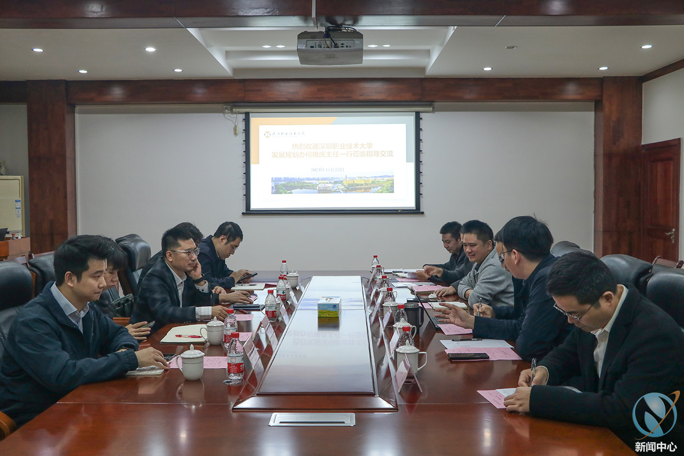 为深入落实“职业教育结对帮扶行动计划”,11月22日,深圳职业技术大学发展规划办何艳庆主任一行到访我校进行业务交流,我校副校长袁光华及双高办,电子信息工程学院,工商管理学院等部门负责人在行政楼第二会议室接待了来访人员,并与对方进行亲切交流。