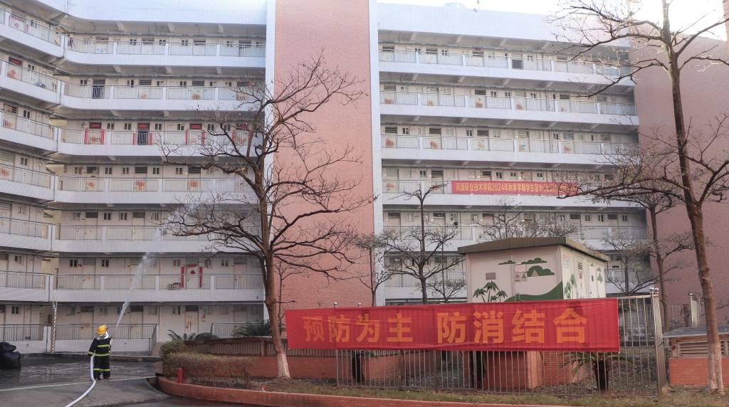 工作人员投放烟雾弹模拟消防工作演练。随着警铃声响起,浓烟弥漫,工作人员引导和指挥安排疏散学生,学生捂住口鼻,降低身姿逃生,并有序地撤离学生宿舍至安全地带。微型消防队到达现场,消防员进入大楼架设水枪浇灭火灾。