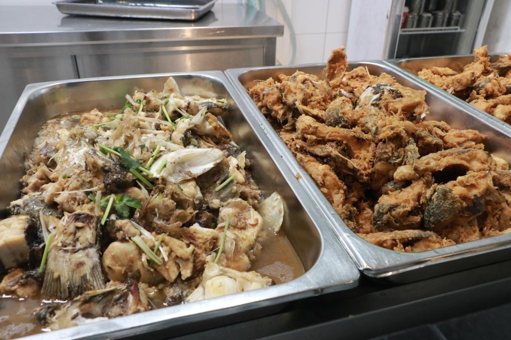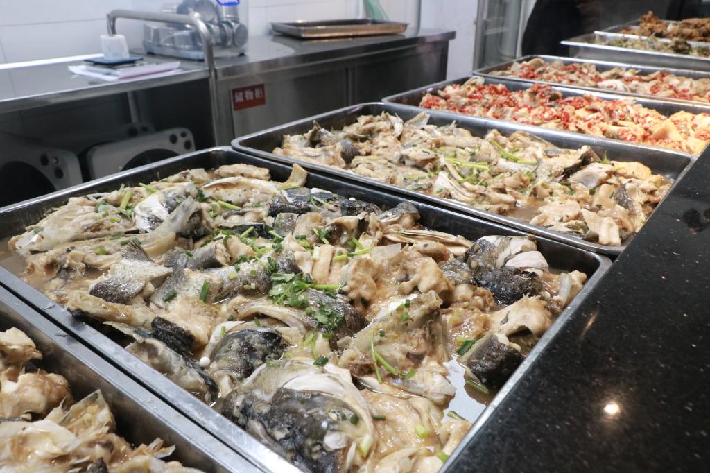 本次活动共捕获约1500斤鱼,捕鱼过程中吸引了许多教职工和同学围观并拍摄记录。鱼材由我校第一、二、三楼食堂平分加工烹饪,分别有鲢鱼、熊鱼、皖鱼,最大的头鱼有30余斤,由8人(专业捕鱼人员)参与捕鱼,后厨人员全员参与鱼肴加工制作,以红烧、清蒸、椒盐、鱼汤等制作烹饪。一楼食堂经理黄少敏介绍,此次捕获的鲜鱼被平均分配至三个食堂,后厨团队以剁椒鱼、香辣炸鱼、清蒸鱼等多样菜品,免费供应给师生,让每一位河职人都能感受到这份来自荟萃湖的馈赠。二楼食堂经理苏映平表示,他们准备了剁椒蒸鱼头、香酥鱼、红烧鱼、豆腐鱼头汤等多样美味,等待师生的品尝。三楼食堂厨师长邱林健则表示,他们的团队主要负责鱼头汤、清蒸鱼、红烧鱼、甜酸鱼四个菜系,每一道菜都是对食材的极致尊重。