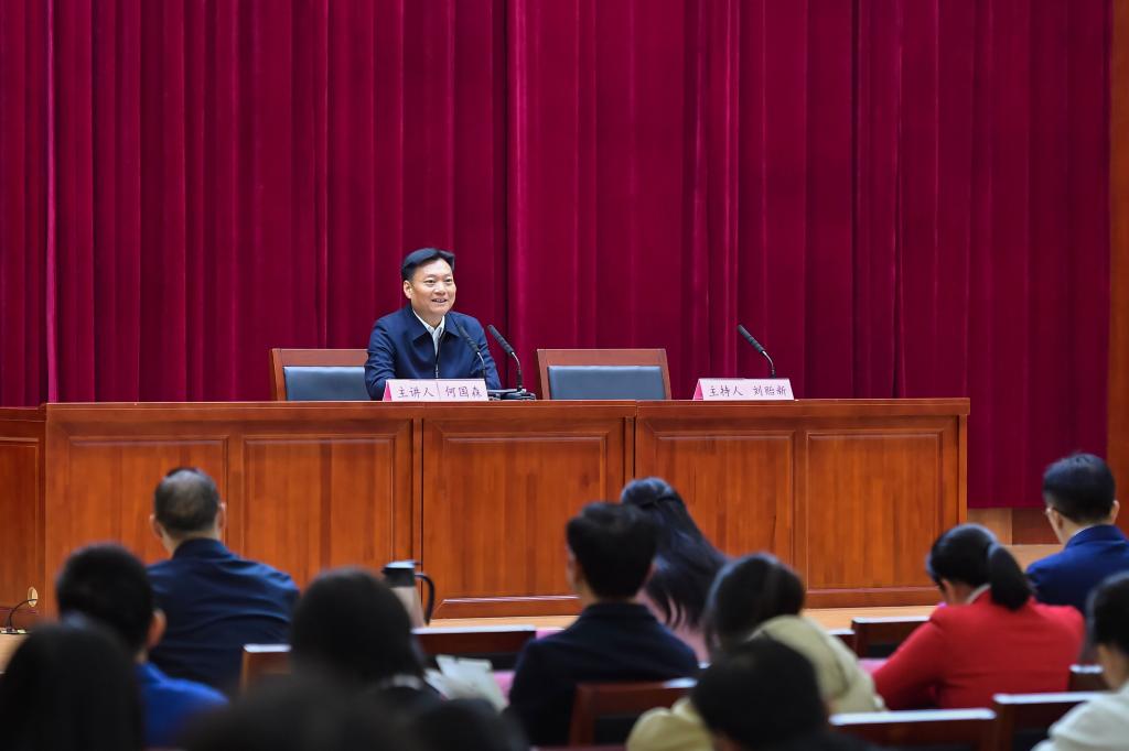 何国森书记说,河源作为底蕴深厚、历史悠久的千年古邑,在不同时期都积极谋划变革、参与变革、推进变革,在革新中焕发出新的生机与活力。当前,河源锚定加快实现绿色崛起使命任务,接续推进“138”具体安排,持续推动重点领域和关键环节改革,抓紧抓实“百千万工程”、制造业当家、绿美生态建设、保障和改善民生等重点工作,努力让经济发展“快”起来、城乡建设“火”起来、生态环境“美”起来、人民生活“好”起来。希望广大师生更加自觉地融入到改革大潮中来,争做进一步全面深化改革的坚定拥护者、积极践行者,共同为改革支招、一起为改革发力,助推河源的改革开放事业打开新天地。