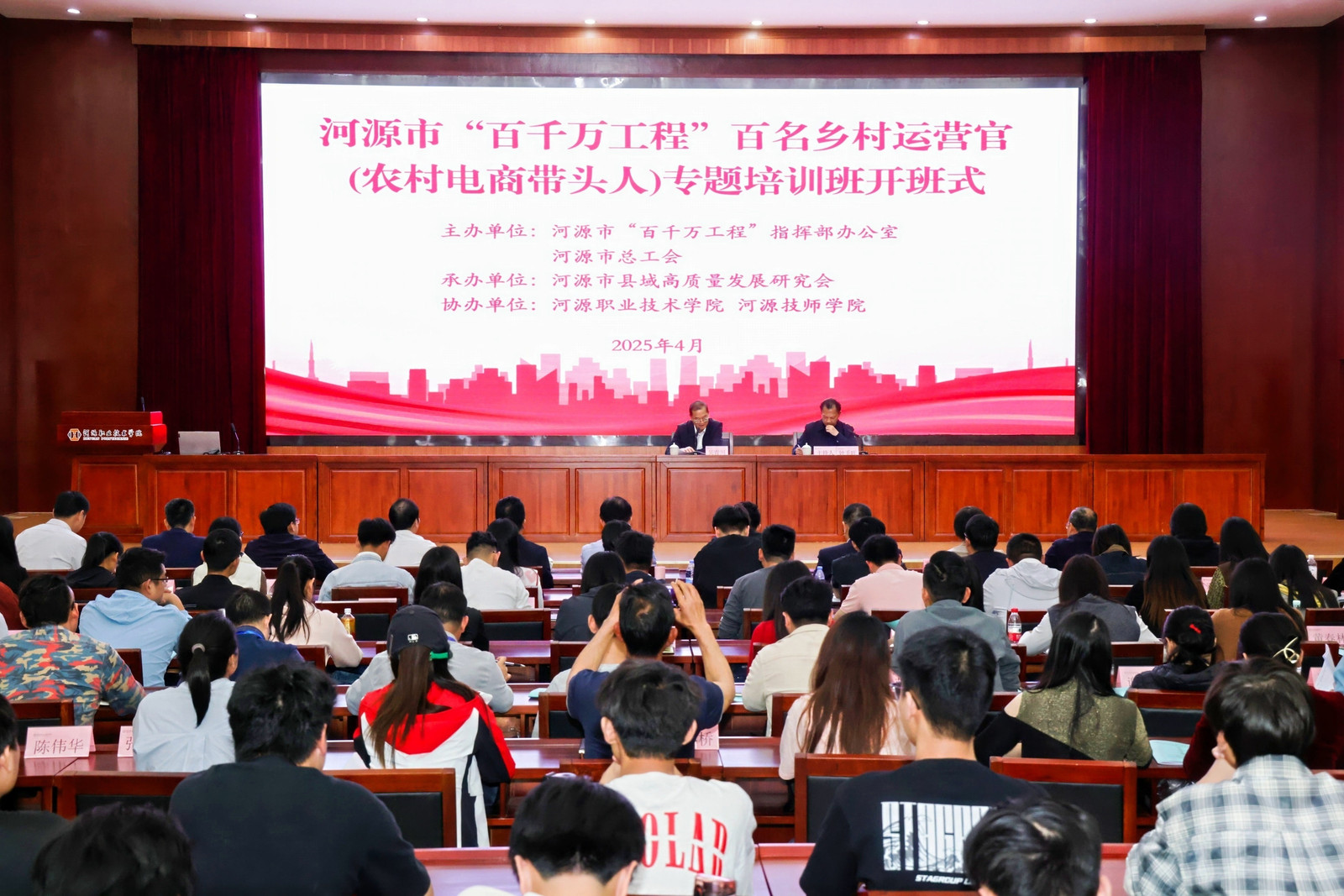 4月7日,河源市“百千万工程”百名乡村运营官(农村电商带头人)专题培训班开班式在我校学术交流中心报告厅举行。培训班由河源市“百千万工程”指挥部办公室与总工会主办、河源市县域高质量发展研究会承办、BTY.COM与河源技师学院协办,市委副书记吴青川,我校校长刘贻新,市总工会常务副主席黄远程,市“百千万工程”指挥办、市人社局、市农业农村局、市商务局、市文广旅体局、河源技师学院、河源理工学校等分管负责同志以及106位农村电商带头人学员出席开班式。开班式由市人大常委会党组成员、副主任,市总工会主席钟壬旺主持。