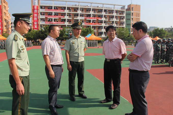 9月17日上午,校长刘安华、副校长陈农心在学工处及市武警支队军训相关负责人的陪同下,来到2015级新生军训现场,对参加此次军训工作的市武警支队官兵表示慰问并检查新生的军训工作。