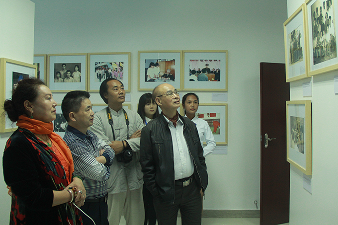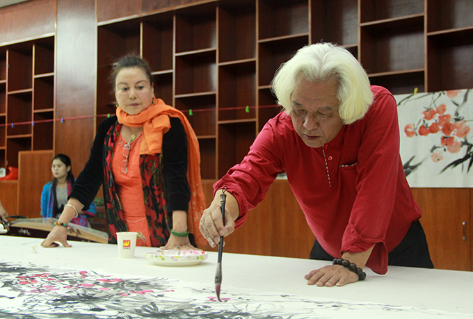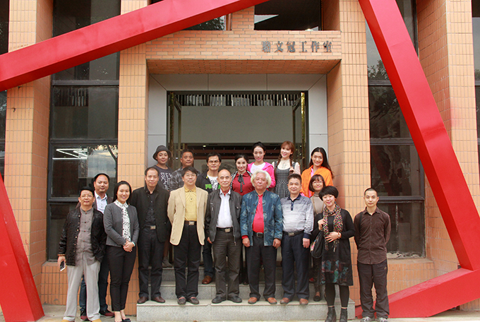 讲座结束后,陈建生、骆文冠先生一行在河职院领导的陪同下参观了何健生图片展、张其彬图片展与骆文冠艺术展。当晚,陈建中、骆文冠先生在河职院骆文冠艺术区工作室与学校美术教师互动交流。骆文冠先生现场挥毫,与其他艺术家一起合作完成了富丽秀美的国画《东江春满图》。