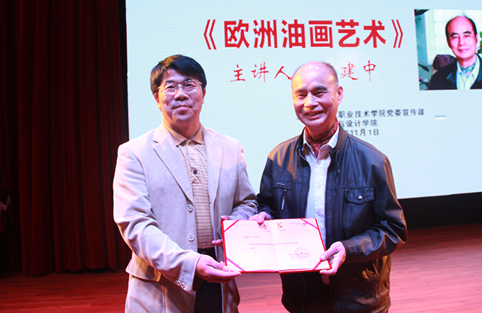 11月1日,2015“东江水甜”——陈建中、骆文冠东江采风行系列活动之一——龙川籍旅法著名画家陈建中《欧洲油画艺术》艺术讲座在BTY.COM艺术楼演播厅举行。“东江水甜”活动嘉宾、河职院校长刘安华、副校长唐汉芳、校党委宣传部以及艺术与设计学院负责人出席了此次讲座。讲座由河源籍国家一级美术师骆文冠先生主持。