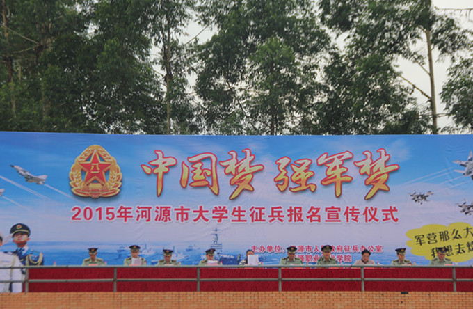 5月27日,我校在田径运动场召开2015年河源市大学生征兵报名宣传仪式。市军分区参谋长杨庆华、源城武装部领导、学工处负责人及二级学院副书记、辅导员、学生代表参加了此次宣传仪式。
