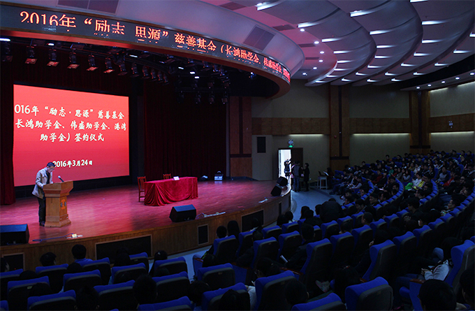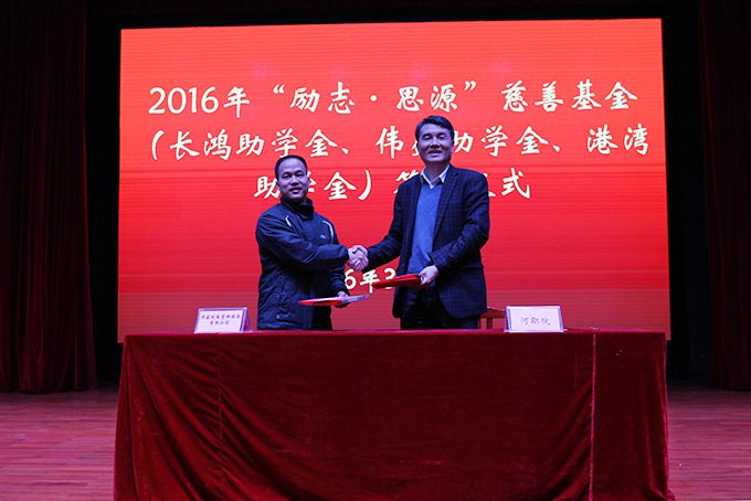 3月24日,我校在艺术楼演播厅举行2016年“励志·思源”慈善基金签约仪式。莅临本次活动的领导有我校校长陈德清、副校长陈农心、广东长鸿实业集团有限公司董事蔡金新、伟盛公司驻BTY.COM第一食堂经理梁焕程、港湾公司驻BTY.COM第二食堂经理冯明超,以及学院副书记、辅导员、学生代表等。