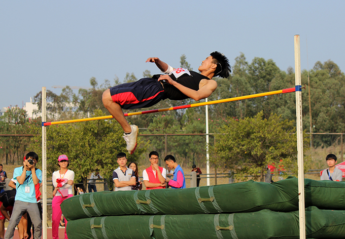 同一时间,我校男子跳高决赛在田径场拉开序幕。