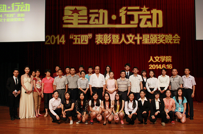 6月16日,我校人文学院于学术报告厅举行2014五四表彰暨人文十星颁奖晚会。“优秀团员”、“五四红旗团支部”、“人文十星”等先进个人、组织受到嘉奖,十颗“星星”更是凭借其奋进与动人的先进典型,赢得满堂祝贺。