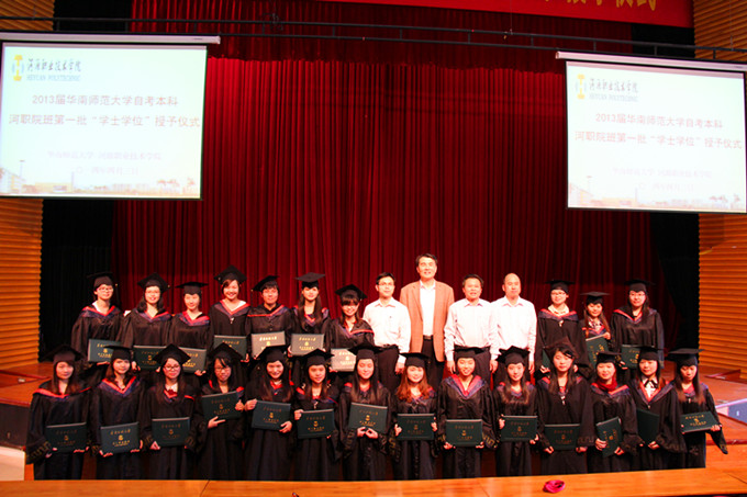 4月3日,受华南师范大学委托,2013届华南师范大学自考本科河职院班第一批学士学位授予仪式在我校报告厅举行,副校长陈德清出席仪式并为学员颁发证书。