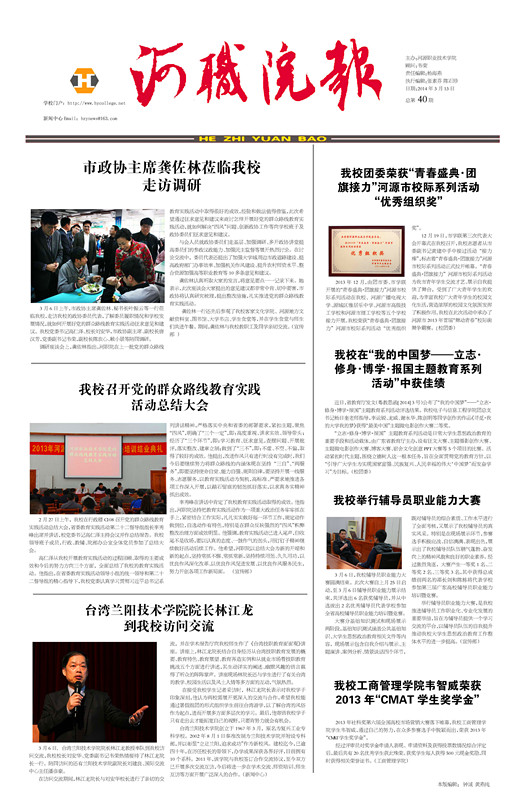 3月31日,河职院报电子版40期上线。请大家点击此网盘链接http://yun.baidu.com/pcloud/album/info?uk=2067151997&album_id=2554793686261504517下载后阅读(JPG附件下载后可在电脑中放大清晰阅读)。