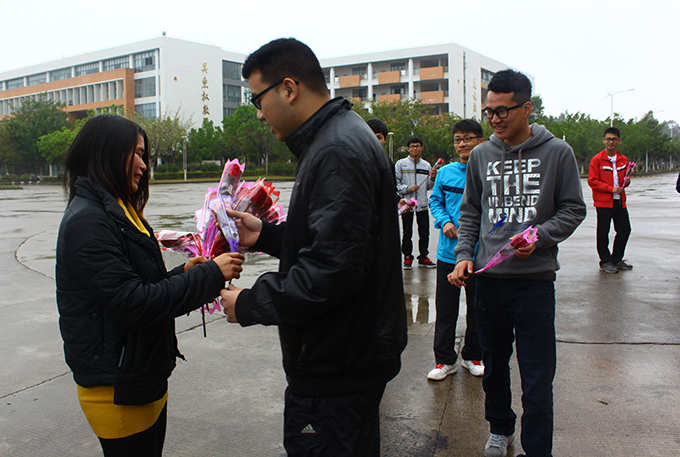 3月7日是各地高校盛行的女生节。在这天,我校12应用电子1班的46名男生用三天时间秘密策划了一场献花活动,为班上唯一的女生献上了一份特殊的礼物。该班男女生比例为46:1,“得天独厚”的条件让班上唯一女生黄同学拥有了一个弥足珍贵的回忆。